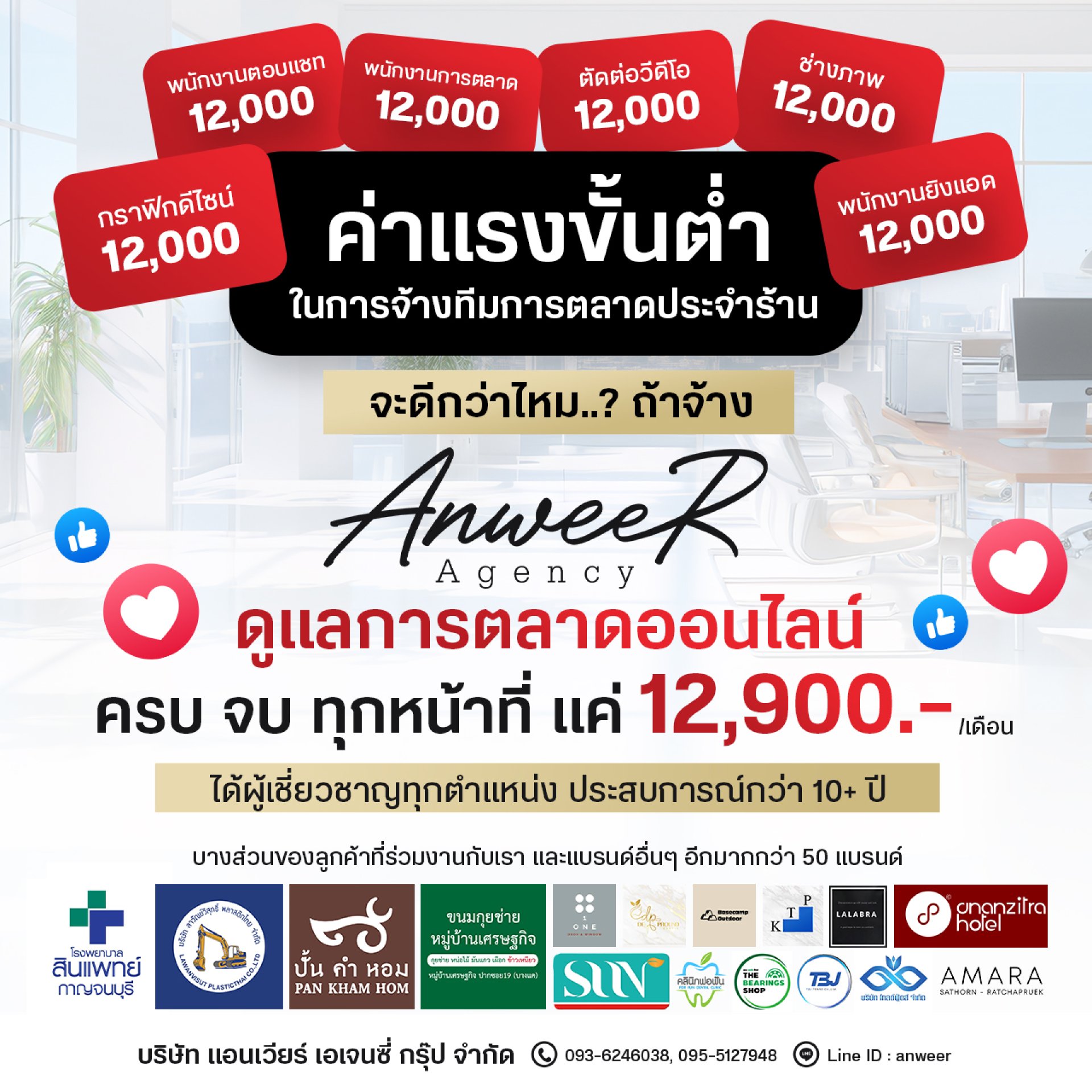 ที่ AnweeR Agency เรามีบริการดูแลการตลาดออนไลน์แบบครบวงจร ในราคาเริ่มต้นเพียง 12,900 บาท/เดือนเท่านั้น